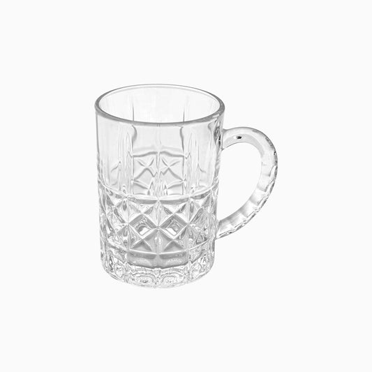• Clear glass mug with diamond cut pattern on a white background